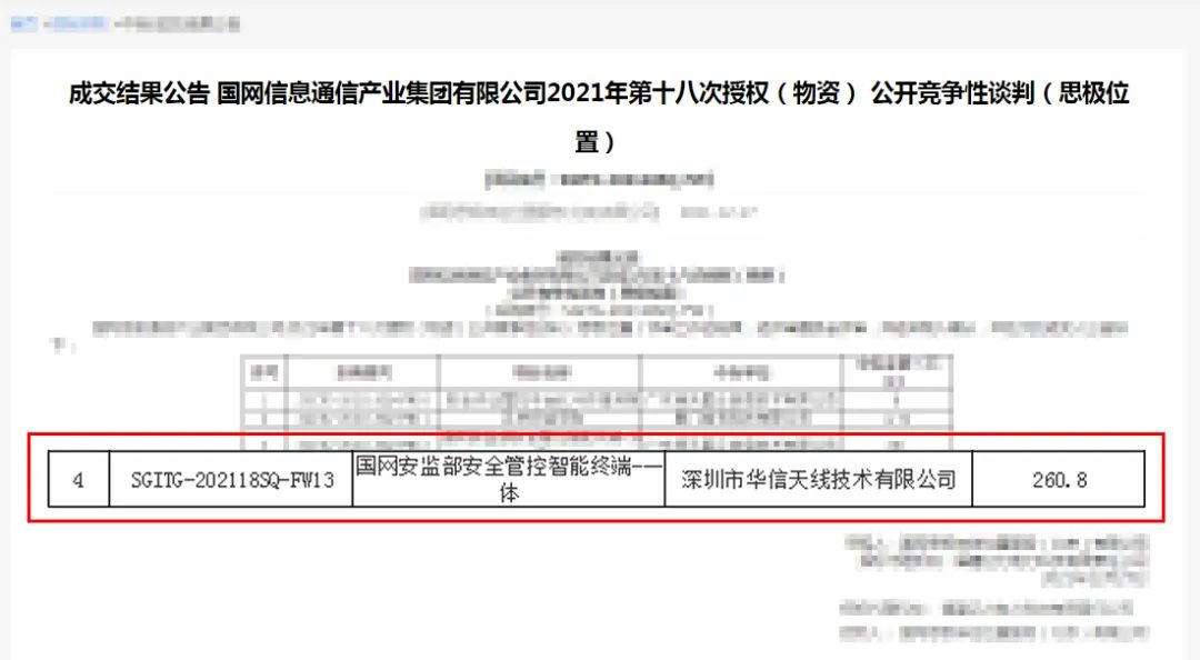 2021年12月27日,國網(wǎng)子公司公布安全管控智能終端-一體項目中標(biāo)結(jié)果,華信天線成功中標(biāo),中標(biāo)金額260.8萬元。