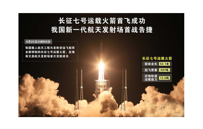 25日,我國(guó)載人航天工程為發(fā)射貨運(yùn)飛船而全新研制的長(zhǎng)征七號(hào)運(yùn)載火箭首次發(fā)射圓滿成功。 作為我國(guó)新一代高可靠、高安全、無(wú)毒、無(wú)污染的中型運(yùn)載火箭,長(zhǎng)征七號(hào)運(yùn)載火箭,將有效提升我國(guó)進(jìn)出空間的能力。