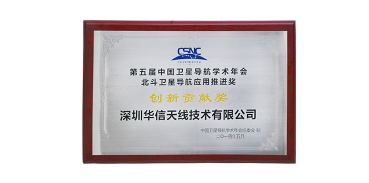 2014年5月21日,“第五屆中國衛(wèi)星導(dǎo)航學(xué)術(shù)年會(huì)衛(wèi)星導(dǎo)航應(yīng)用推進(jìn)獎(jiǎng)”評(píng)比活動(dòng)頒獎(jiǎng)典禮在江蘇南京金陵會(huì)議中心隆重舉行,為表彰深圳市華信天線技術(shù)有限公司(以下稱:華信天線)在應(yīng)用技術(shù)創(chuàng)新、應(yīng)用模式創(chuàng)新,推動(dòng)衛(wèi)星導(dǎo)航產(chǎn)業(yè)發(fā)展過程中做出杰出貢獻(xiàn)。中國衛(wèi)星導(dǎo)航學(xué)術(shù)年會(huì)組委會(huì)在頒獎(jiǎng)典禮上為華信天線頒發(fā)了“創(chuàng)新貢獻(xiàn)獎(jiǎng)”榮譽(yù)獎(jiǎng)牌及證書。
