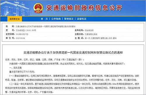 日前,交通運輸部辦公廳發(fā)布《關(guān)于加快推進新一代國家交通控制網(wǎng)和智慧公路試點的通知》,決定在北京、河北、吉林、江蘇、浙江、福建、江西、河南、廣東等九省份加快推進新一代國家交通控制網(wǎng)和智慧公路試點。