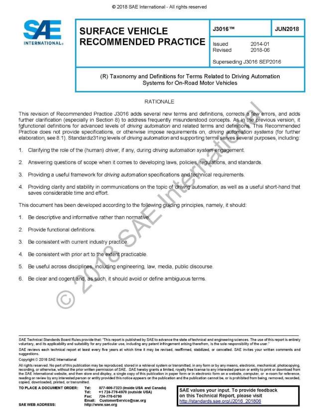 第一版J3016于2014年1月發(fā)布,用以明確不同級別自動(dòng)駕駛技術(shù)之間的差異性。2016年9月,美國交通運(yùn)輸部發(fā)布了關(guān)于自動(dòng)化車輛的測試與部署政策指引,明確將SAE International J3016標(biāo)準(zhǔn)確立為定義自動(dòng)化/自動(dòng)駕駛車輛的全球行業(yè)參照標(biāo)準(zhǔn),用以評定自動(dòng)駕駛技術(shù)。此后,全球諸多汽車行業(yè)相關(guān)的企業(yè)也采用了SAE J3016對自身相關(guān)的產(chǎn)品進(jìn)行技術(shù)定義。