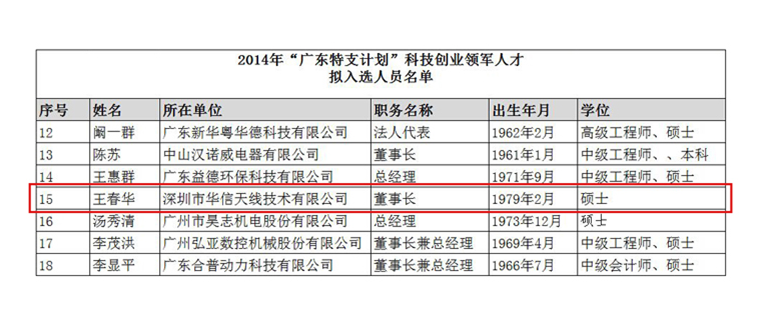 近日,2014年“廣東省特支計(jì)劃創(chuàng)業(yè)領(lǐng)軍人才”名單新鮮出爐,華信董事長王春華先生名列其中,喜獲“廣東省科技創(chuàng)業(yè)領(lǐng)軍人才”表彰。